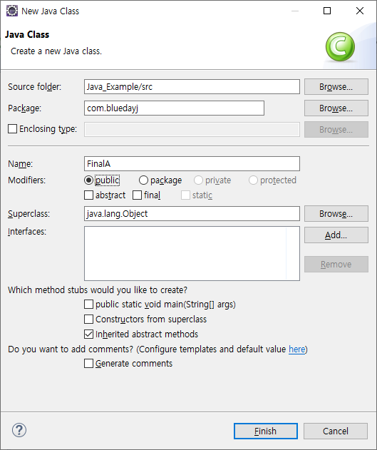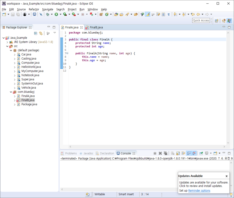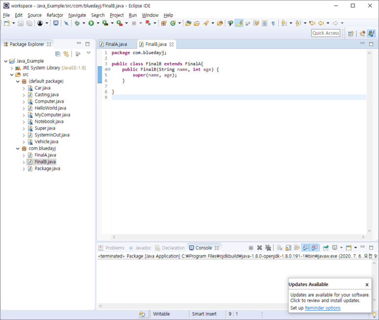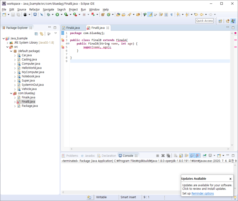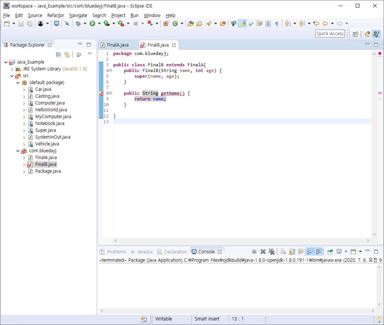 그러고 나서 FinalB 클래스를 만들고 FinalA 클래스를 상속해 보도록 하겠습니다.