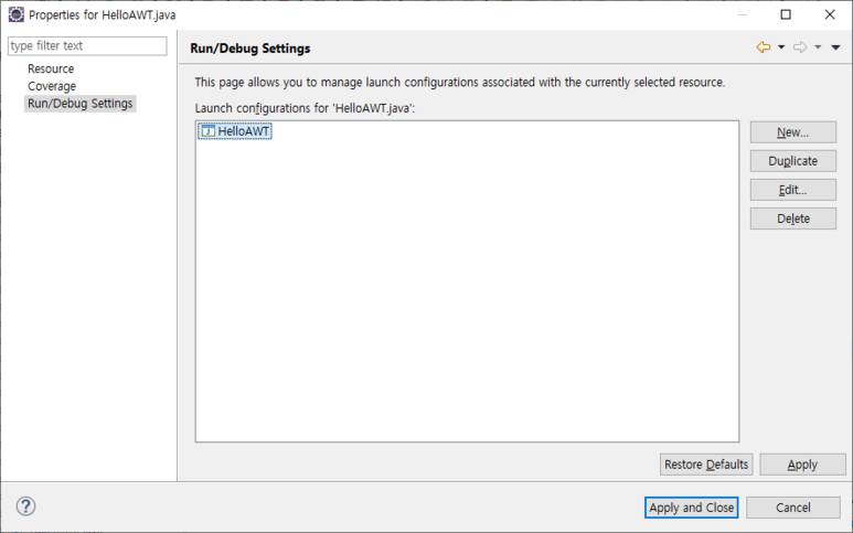해당 파일(HelloAWT.java)의 프로퍼티(Alt+Enter)에 들어가서 Run/Debug Settings 클릭하면 해당 파일명이 보입니다. 파일을 선택선택한 후 Edit버튼을 클릭합니다.