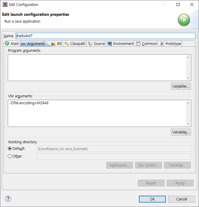 Arguments 탭의 VM arguments에 -Dfile.encoding=MS949를 입력하고 OK버튼을 클릭합니다.