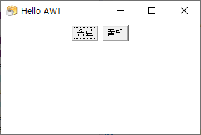 위 소스 코드는 프레임에 종료와 출력이라는 버튼을 추가하는 소스입니다. 소스상에서 Panel은 버튼과 같은 컴포넌트를 묶은 틀이라고 생각하시면 됩니다. 프레임이나 패널에 추가할 경우에는 add() 메소드를 사용하면 됩니다.