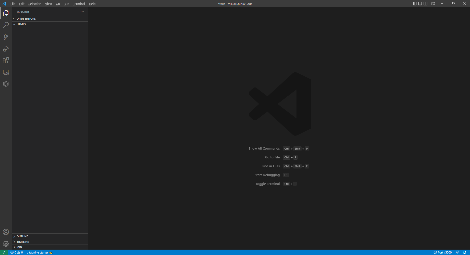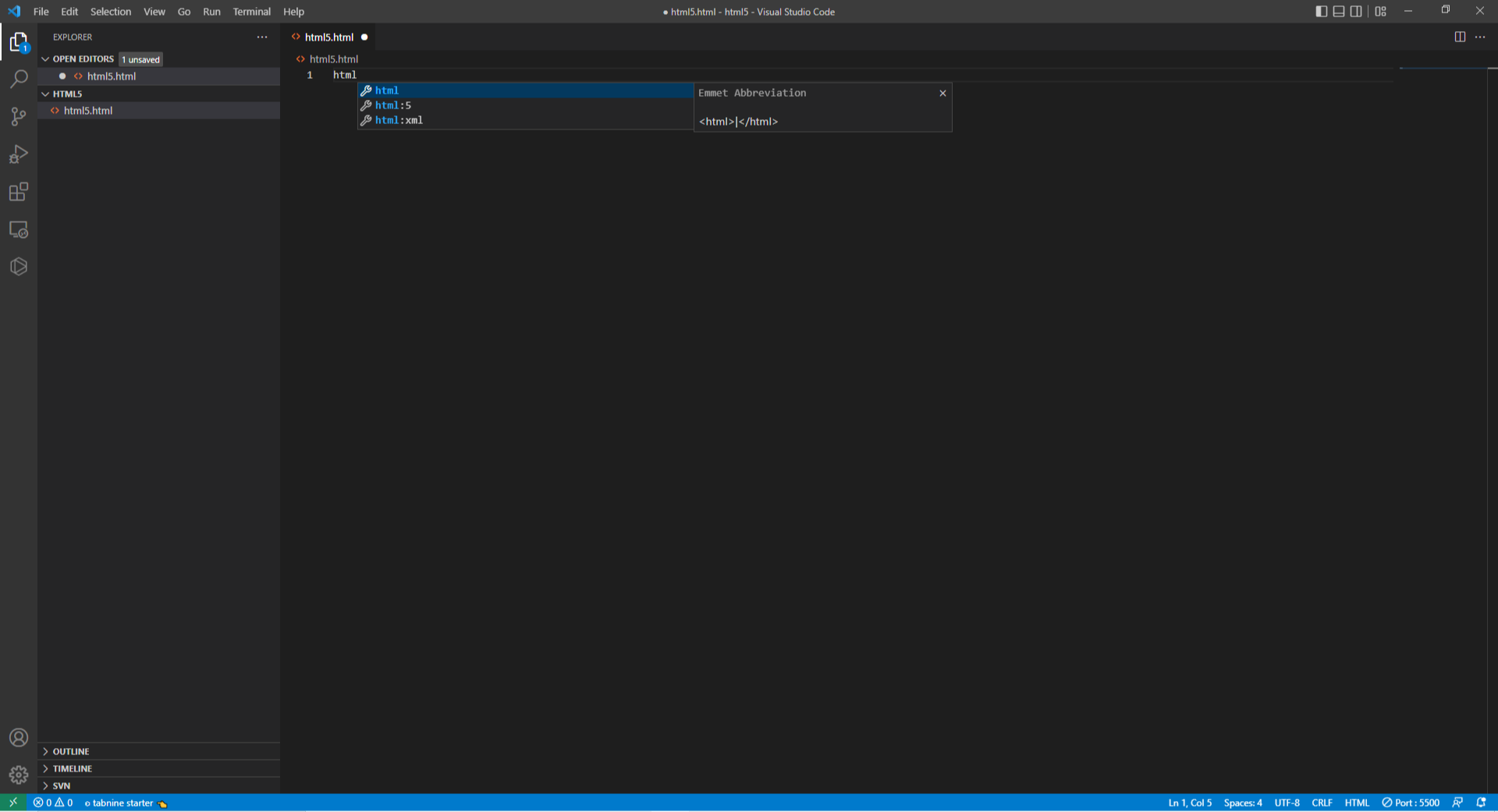 html5를 선택하면 아래 그림과 같이 기본 Doctype과 메타태그가 생성됩니다.