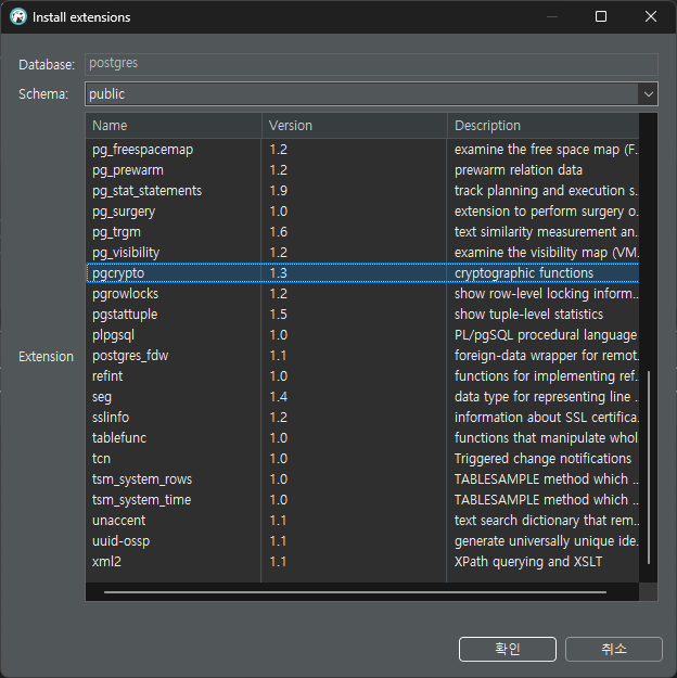 PostgreSQL의 암호화, 복호화를 하기위해 extensions의 pgcrypto를 먼저 설치합니다.